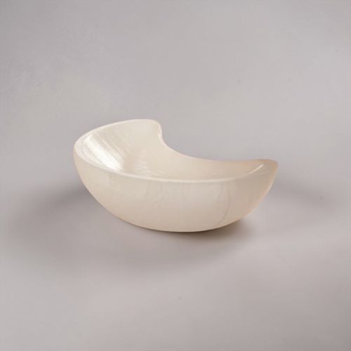 De maanvormige seleniet schaal is niet alleen krachtig, maar ook een elegante toevoeging aan je interieur. De natuurlijke witte kleur past in vrijwel elke ruimte. Bovendien zorgt de subtiele glans voor een serene en luxe uitstraling.