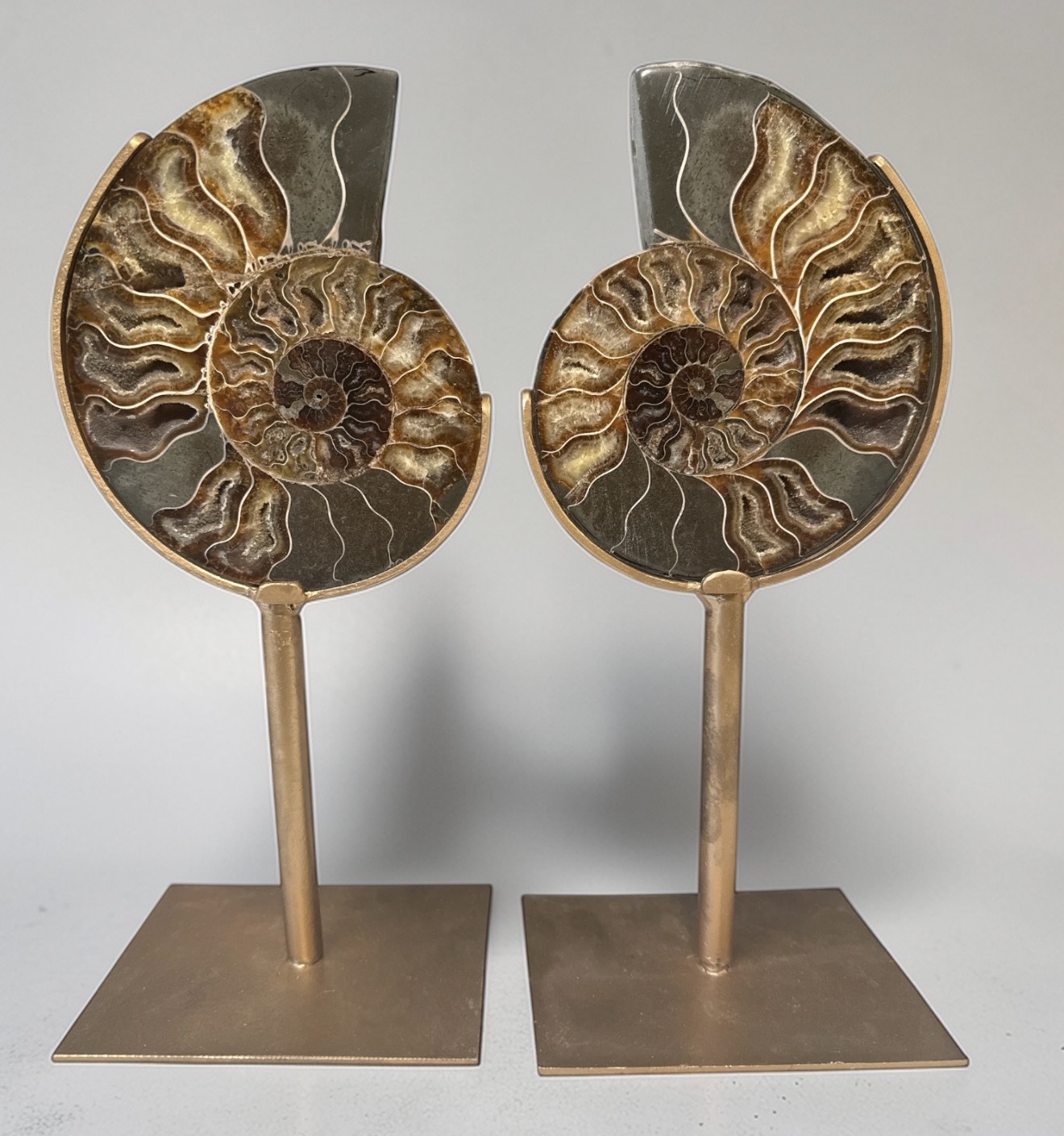 Deze set ammonieten op standaard is niet alleen krachtig, maar ook visueel indrukwekkend. De warme tinten van het fossiel combineren prachtig met de handgemaakte oud gouden standaard. Bovendien zorgt de geslepen vorm ervoor dat elk detail zichtbaar wordt, wat elke set uniek maakt.