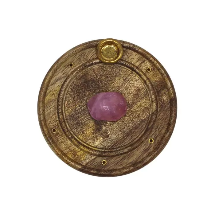 Wierookhouder met Rozenkwarts van Hout rond (10 cm) voor stokjes en kegels